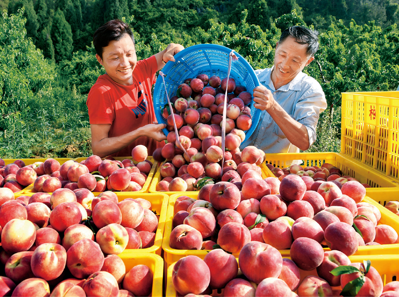2020年5月22日,湖南省永州市道县仙子脚镇下白村,春桃专业合作社的果农在装筐早熟春桃。近年来,该村坚持基层党建与脱贫攻坚相结合,村党支部引导农民先后成立了春桃、柑橘专业合作社,通过发展产业带动了148户贫困户增收脱贫。 湖南日报记者 蒋克青 黄爱平/摄
