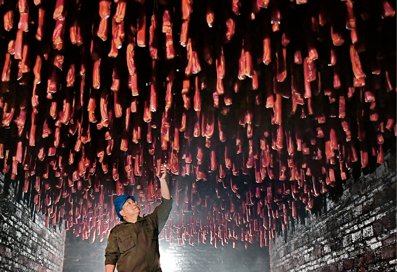2020年5月9日,湖南省湘西州古丈县红石林镇,一名企业工人在查看腊肉熏制情况。这家企业成立于2013年,目前已经发展成为集生猪养殖、定点屠宰、腌腊制品生产、冷鲜肉加工及销售为一体的农产品加工龙头企业,先后解决248位村民的就业问题,带动了260户贫困户、1800余人增收脱贫。 湖南日报记者 童迪 刘小军/摄