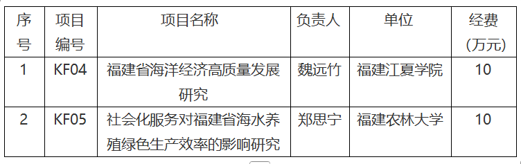 根据《关于申报福建海洋经济绿色发展创新团队开放课题(第二轮)的通知》,本着公平、公开、公正的原则,经团队审定,同意资助以下2项课题,现将关于申报福建海洋经济绿色发展创新团队开放课题(第二轮)立项名单公布如下: